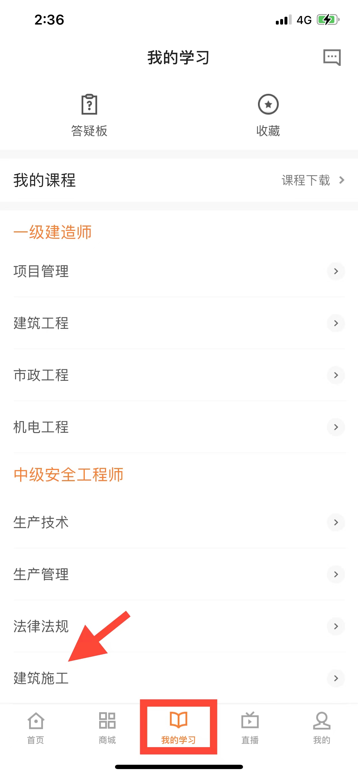 1、點擊我的學習找到建筑施工科目。
