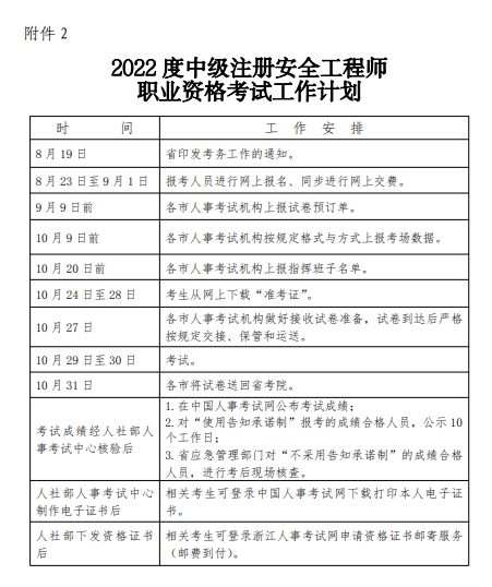 浙江2022年安全工程師網上報名時間:8月23日-9月1日;繳費時間:8月23日-9月1日;打印準考證:10月24日-28日。