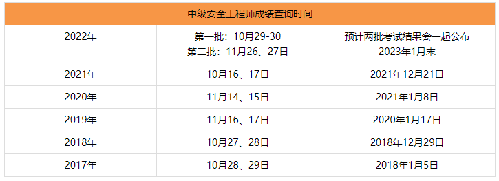 由上表可以推測(cè)出,2022年的中級(jí)注冊(cè)安全工程師成績(jī)查詢時(shí)間預(yù)計(jì)在2023年2月上旬左右。