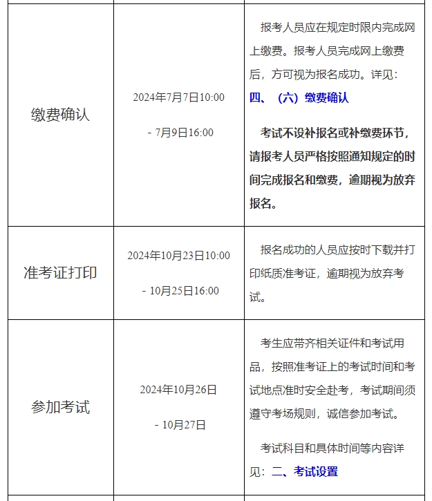 網(wǎng)上繳費(fèi)時(shí)間為2024年7月7日10:00-7月9日16:00,已進(jìn)入網(wǎng)上交費(fèi)流程的考生應(yīng)及時(shí)繳費(fèi),逾期視為放棄報(bào)名??忌赏ㄟ^報(bào)名系統(tǒng)繳費(fèi)平臺(tái)支持的,已經(jīng)開通網(wǎng)上支付功能的銀行卡或電子掃碼支付工具進(jìn)行網(wǎng)上繳費(fèi)。網(wǎng)上繳費(fèi)咨詢電話:95070。