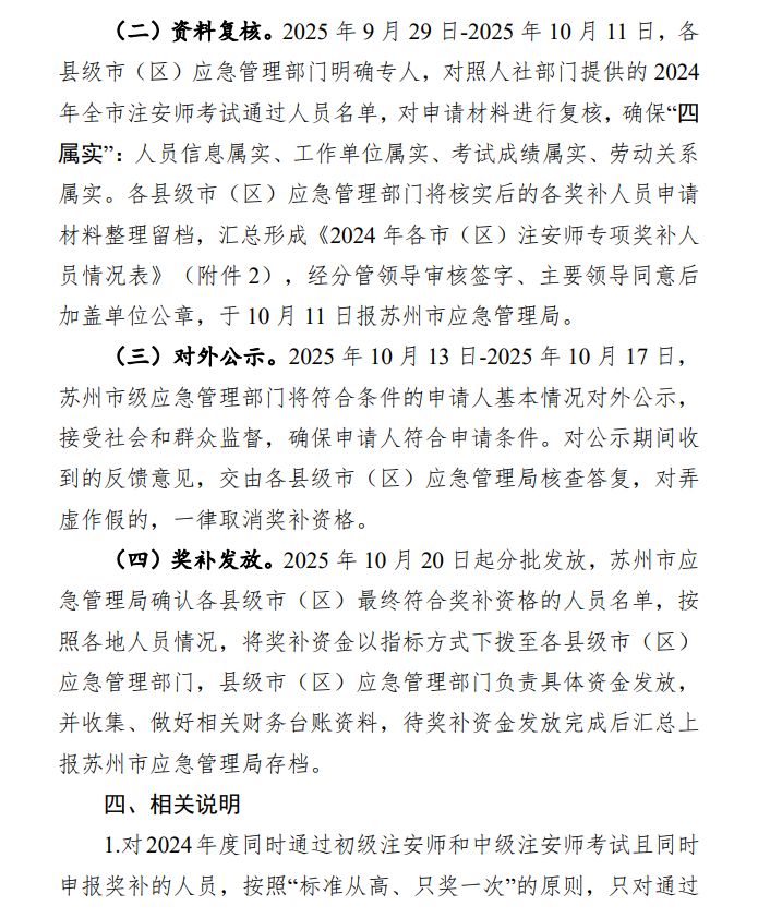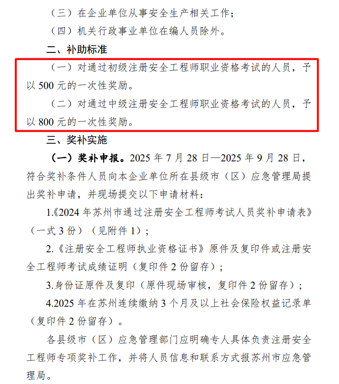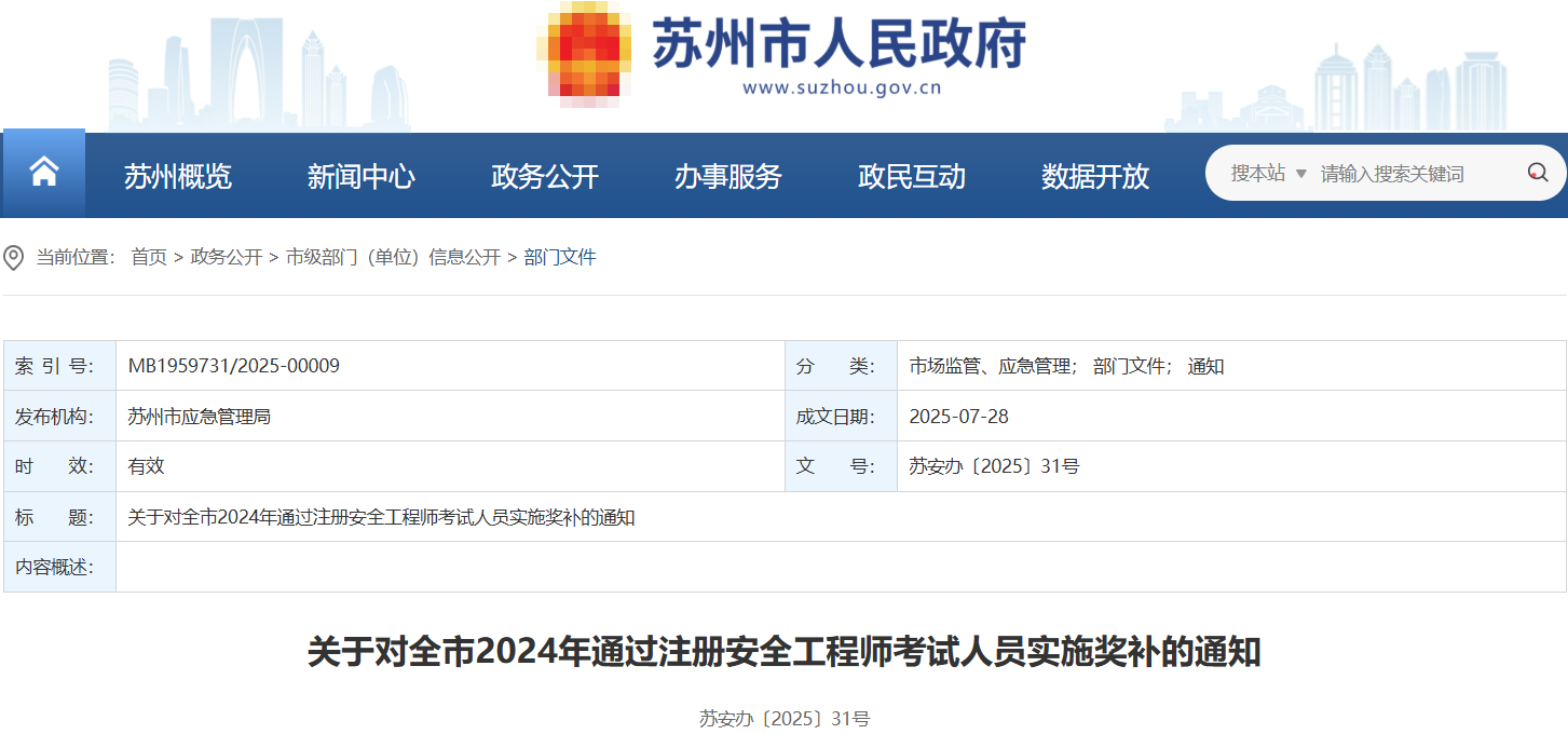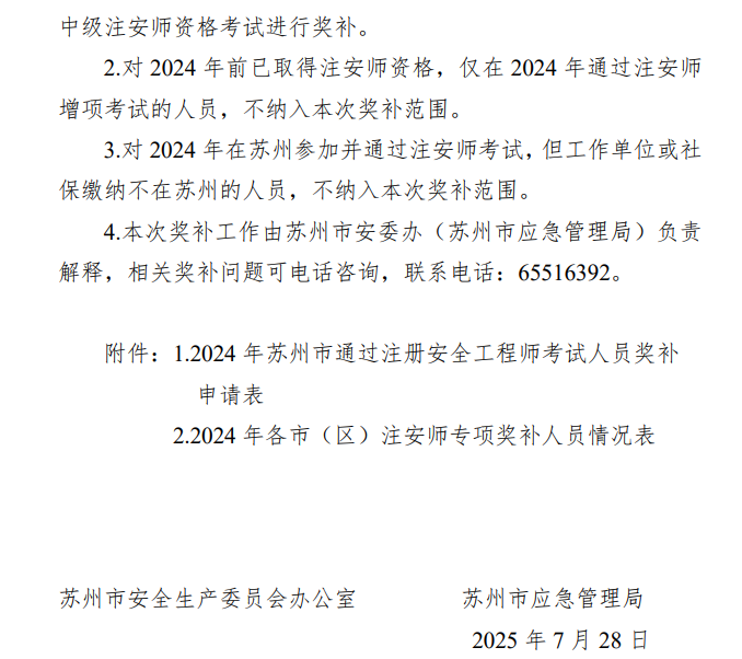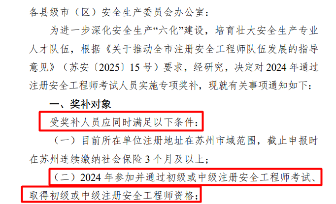 蘇州對全市2024年通過注冊安全工程師考試的人員實施獎補