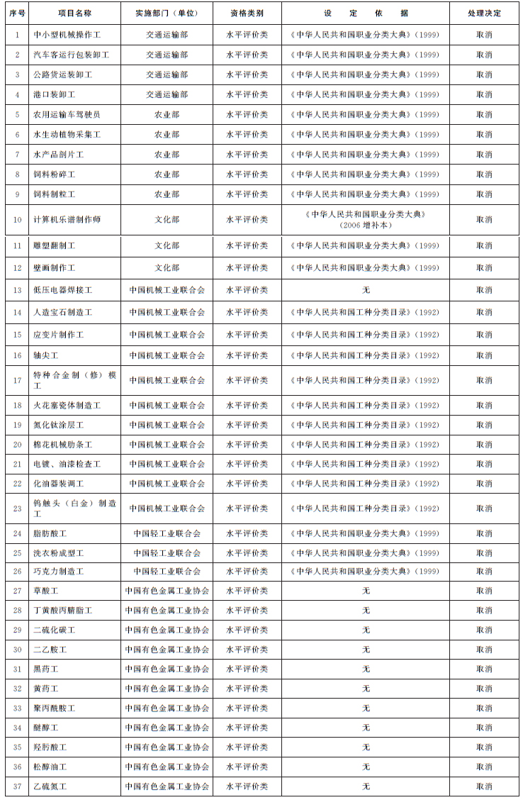 二、取消的技能人員職業(yè)資格許可和認(rèn)定事項(xiàng)(共計37項(xiàng),均為水平評價類)