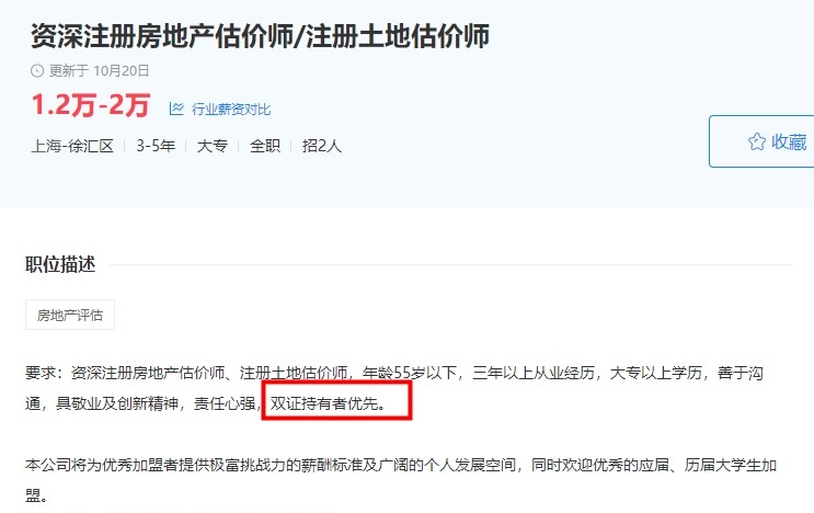 小編去某聯(lián)招聘中搜了一下工資較高的房地產(chǎn)估價(jià)師招聘要求,基本不約而同的要求具有房地產(chǎn)估價(jià)師證書或者土地估價(jià)師證書,其中很多公司說明持雙證者會(huì)優(yōu)先考慮,甚至有的公司對(duì)持雙證者會(huì)有額外的福利待遇。