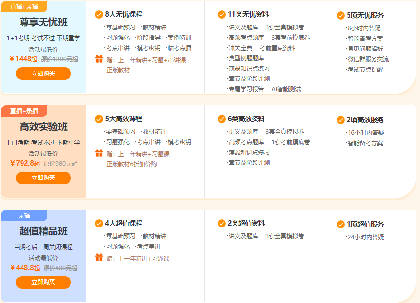 1、8大無憂課程+11類無憂資料+5項(xiàng)無憂服務(wù)+贈上一年精講、習(xí)題、串講課和正版教材(包郵),針對較難的案例分析科目增加專項(xiàng)訓(xùn)練課程