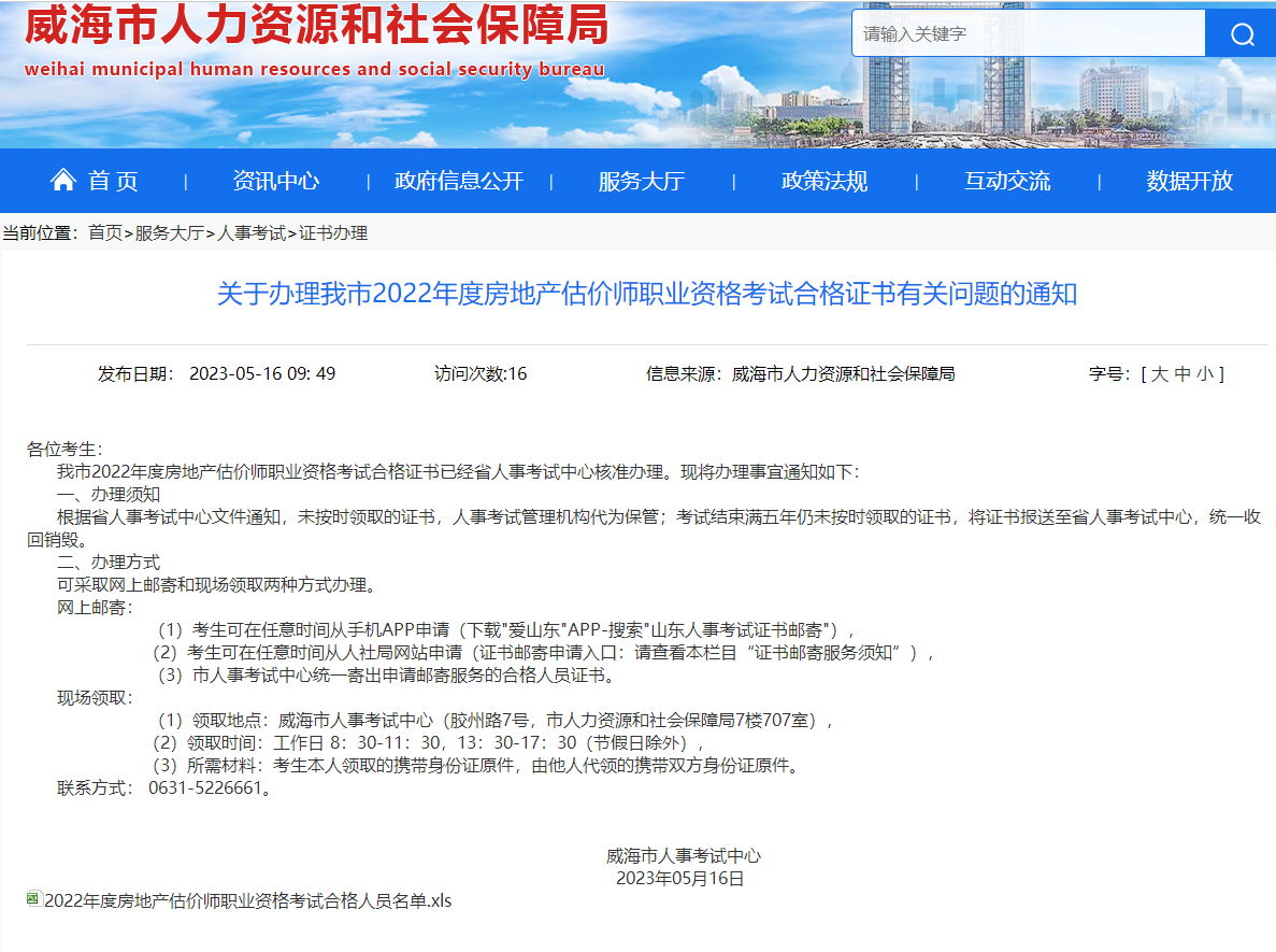 威海市人力資源和社會(huì)保障局官網(wǎng)于2023年5月16日發(fā)布【關(guān)于辦理威海市2022年度房地產(chǎn)估價(jià)師職業(yè)資格考試合格證書有關(guān)問題的通知】,辦理方式有以下兩種: