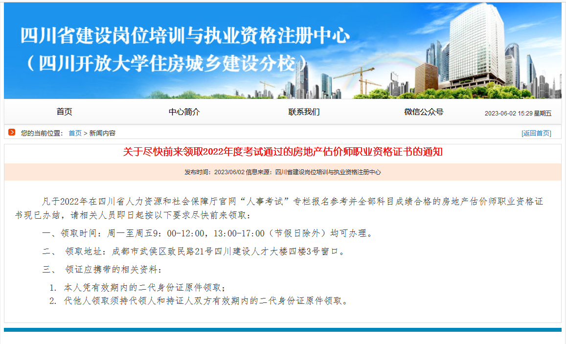 關(guān)于領(lǐng)取2022年度考試通過的四川房地產(chǎn)估價(jià)師職業(yè)資格證書的通知