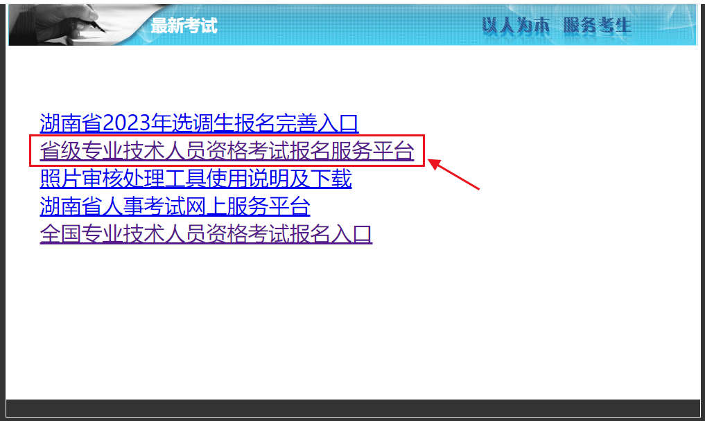 報考人員應(yīng)登錄湖南人事考試網(wǎng)(),點擊“網(wǎng)上報名”中的“省級專業(yè)技術(shù)人員資格考試服務(wù)平臺”,簡稱“網(wǎng)報平臺”,下同)進(jìn)行報名。報名流程有注冊登錄、注冊核查、報名信息填報、報名核查、網(wǎng)上繳費等5個步驟。