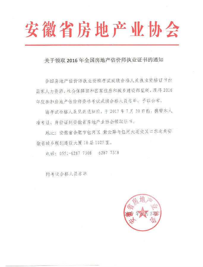 安徽省2016年全國房地產(chǎn)估價師執(zhí)業(yè)證書領取的通知: