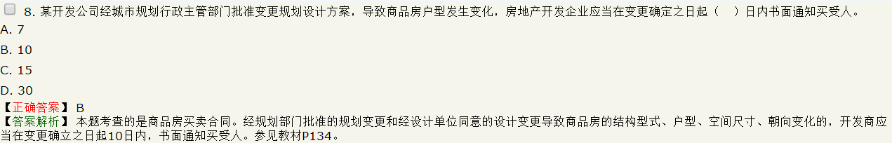 【解析】本題考查的是商品房買賣合同。經(jīng)規(guī)劃部門批準(zhǔn)的規(guī)劃變更、設(shè)計單位同意的設(shè)計變更導(dǎo)致商品房的結(jié)構(gòu)形式、戶型、空間尺寸、朝向、供熱、采暖等方式變化,以及出現(xiàn)合同當(dāng)事人約定的其他影響商品房質(zhì)量或使用功能情形的,房地產(chǎn)開發(fā)企業(yè)應(yīng)當(dāng)在變更確立之日起10日內(nèi),書面通知買受人。參見教材P134。