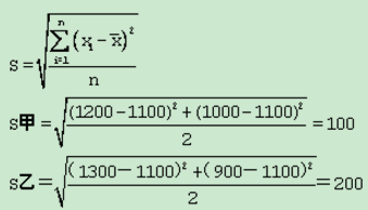 1200和1000與1100的偏差,一定比1300和900比1100的偏離程度小,所以計算出的標準差一定前者小,所以前者風險小。