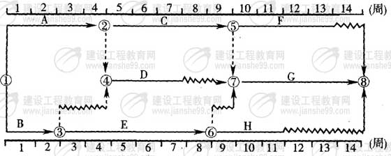 118.某工程雙代號時標網絡計劃執(zhí)行到第3周末和第7周末時,檢查其實際進度如下圖前鋒線所示,檢查結果表明( )。