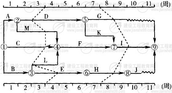 C.工作箭線中實線部分的水平投影長度表示該工作的持續(xù)時間
