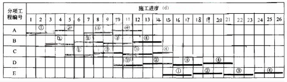 1.某工程由A、B、C、D、E五個分項工程組成,它在平面上劃分為四個施工段,各分項工程在各個施工段上的流水節(jié)拍均為3天。A、B施工過程和B、C施工過程允許平行搭接1天,C、D施工過程和D、E施工過程之間各有2天技術間歇時問。施工單位欲對該工程進行流水施工組織。