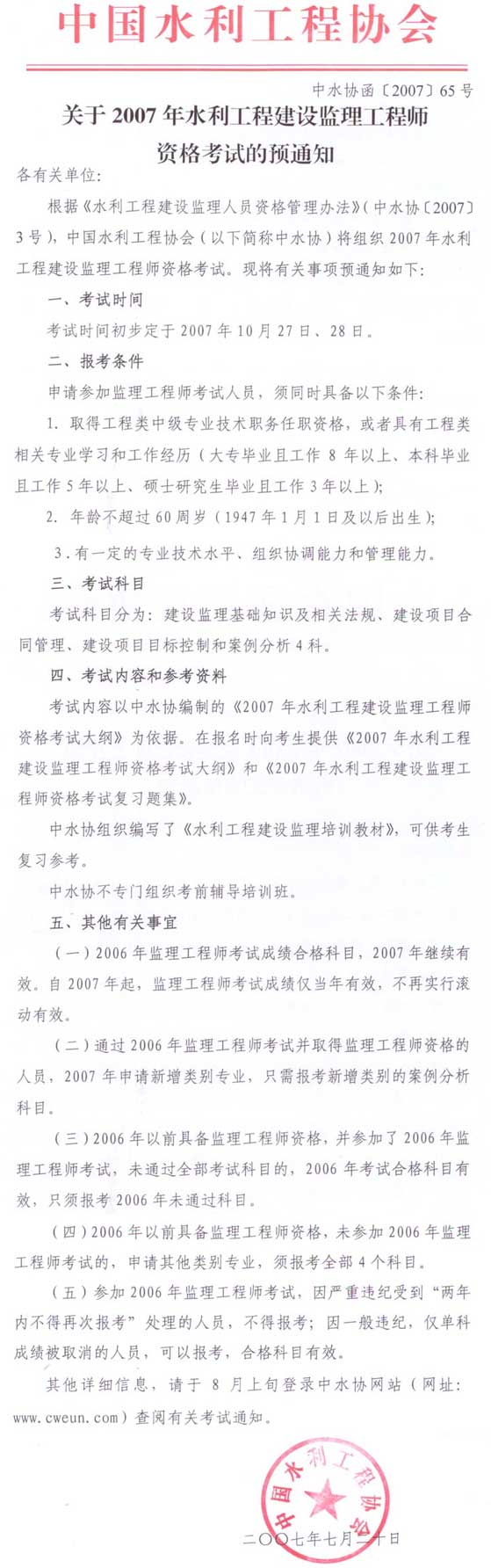 關(guān)于2007年水利工程建設(shè)監(jiān)理工程師資格考試的預(yù)通知