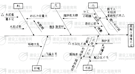 通過(guò)因果分析圖,可以直觀分析出造成混凝土強(qiáng)度不足的人、機(jī)械、材料、方法、環(huán)境等因素。并從眾多因素中選擇出影響大的影響因素(例如水灰比、養(yǎng)護(hù)等條件),在制定對(duì)策計(jì)劃中應(yīng)重點(diǎn)進(jìn)行控制。