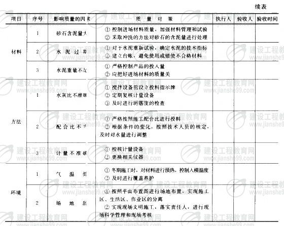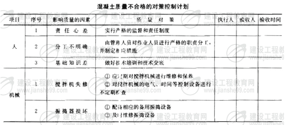 (3)根據(jù)因果分析圖,制定相應(yīng)混凝土強(qiáng)度不足的對(duì)策計(jì)劃。