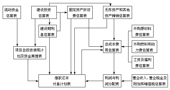 第三類,預(yù)測(cè)項(xiàng)目投產(chǎn)后用規(guī)定的資金來(lái)源歸還固定資產(chǎn)借款本息的情況。借款還本付息計(jì)劃表和利潤(rùn)與利潤(rùn)分配表不是財(cái)務(wù)基礎(chǔ)數(shù)據(jù)測(cè)算表,如此繪制只是為了保持該圖的完整性。