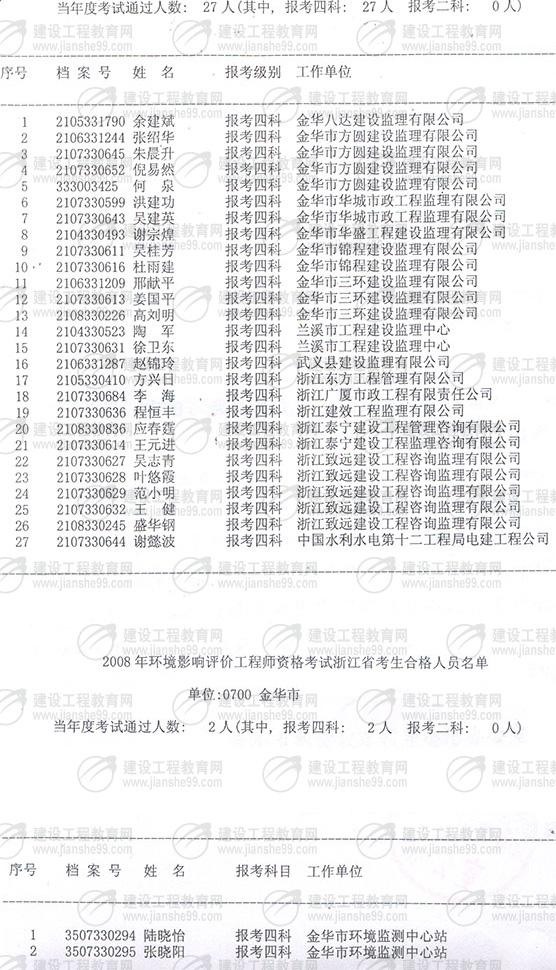金華市2008年度監(jiān)理工程師執(zhí)業(yè)資格考試合格人員名單