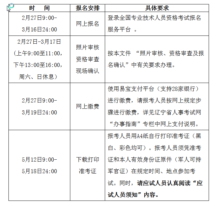 4.新考生(含異地首次轉(zhuǎn)到遼寧報(bào)考考生)報(bào)考時(shí),必須進(jìn)行資格審查和報(bào)名確認(rèn),F(xiàn)場(chǎng)報(bào)名確認(rèn)后,方可進(jìn)行網(wǎng)上繳費(fèi)。新考生應(yīng)持報(bào)名表(照片審核通過(guò)后即可打。2份、相關(guān)證件(身份證、畢業(yè)證、學(xué)位證、工作年限證明等)原件和復(fù)印件2份到省或市人事職稱管理部門或人事考試部門進(jìn)行現(xiàn)場(chǎng)資格審查。符合部分科目免試條件的報(bào)考人員還須提交《資格考試科目免試申報(bào)表》2份和免試相關(guān)材料(職稱證、培訓(xùn)合格證等)原件及復(fù)印件2份!顿Y格考試科目免試申報(bào)表》和《工作年限證明》可從遼寧人事考試網(wǎng)(www.lnrsks.com)“資料下載”欄目中下載打印,按要求填寫并加蓋單位公章。