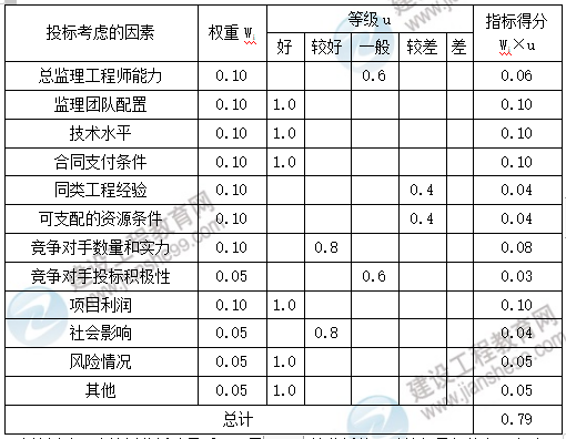 (1)綜合評價法。綜合評價法是指決策者決定是否參加某建設(shè)工程監(jiān)理投標時,將影響其投標決策的主客觀因素用某些具體指標表示出來,并定量地進行綜合評價,以此作為投標決策依據(jù)。