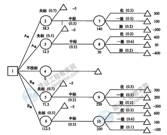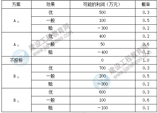 這樣,該工程監(jiān)理單位共有A高、A低、不投標、B高、B低5種方案。