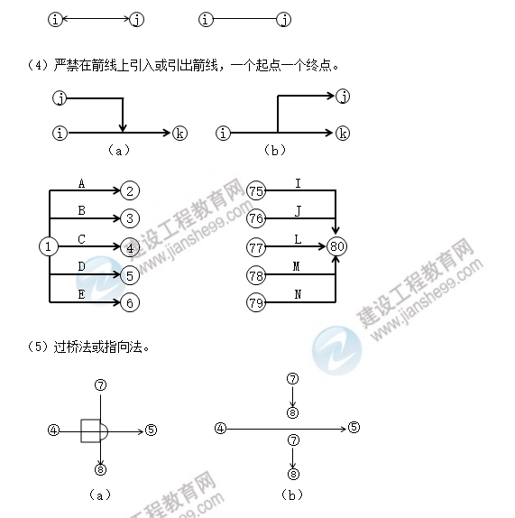 (3)不合格箭線:箭頭指向左方的、雙向箭頭和無箭頭的連線、嚴(yán)禁出現(xiàn)沒有箭尾節(jié)點(diǎn)的箭線和沒有箭頭節(jié)點(diǎn)的箭線。