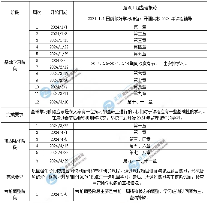 2024年監(jiān)理工程師理論和法規(guī)學(xué)習(xí)計劃時間表(1-5月)