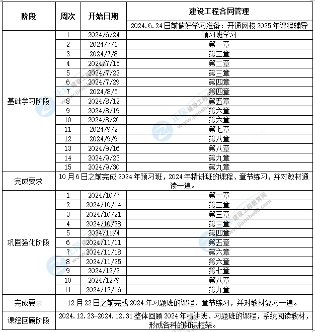 1、整體進(jìn)度說(shuō)明:本計(jì)劃表從2025年1月1日開始執(zhí)行,計(jì)劃于2025年5月16日結(jié)束,共計(jì)19周;其中:基礎(chǔ)學(xué)習(xí)階段安排12周,鞏固強(qiáng)化階段安排6周,考前調(diào)整階段安排1周。學(xué)員可根據(jù)本表的提示,結(jié)合自己的工作,學(xué)習(xí)情況進(jìn)行細(xì)化,并按網(wǎng)校要求完成聽課、做題的學(xué)習(xí)任務(wù),基本可滿足考試需要。