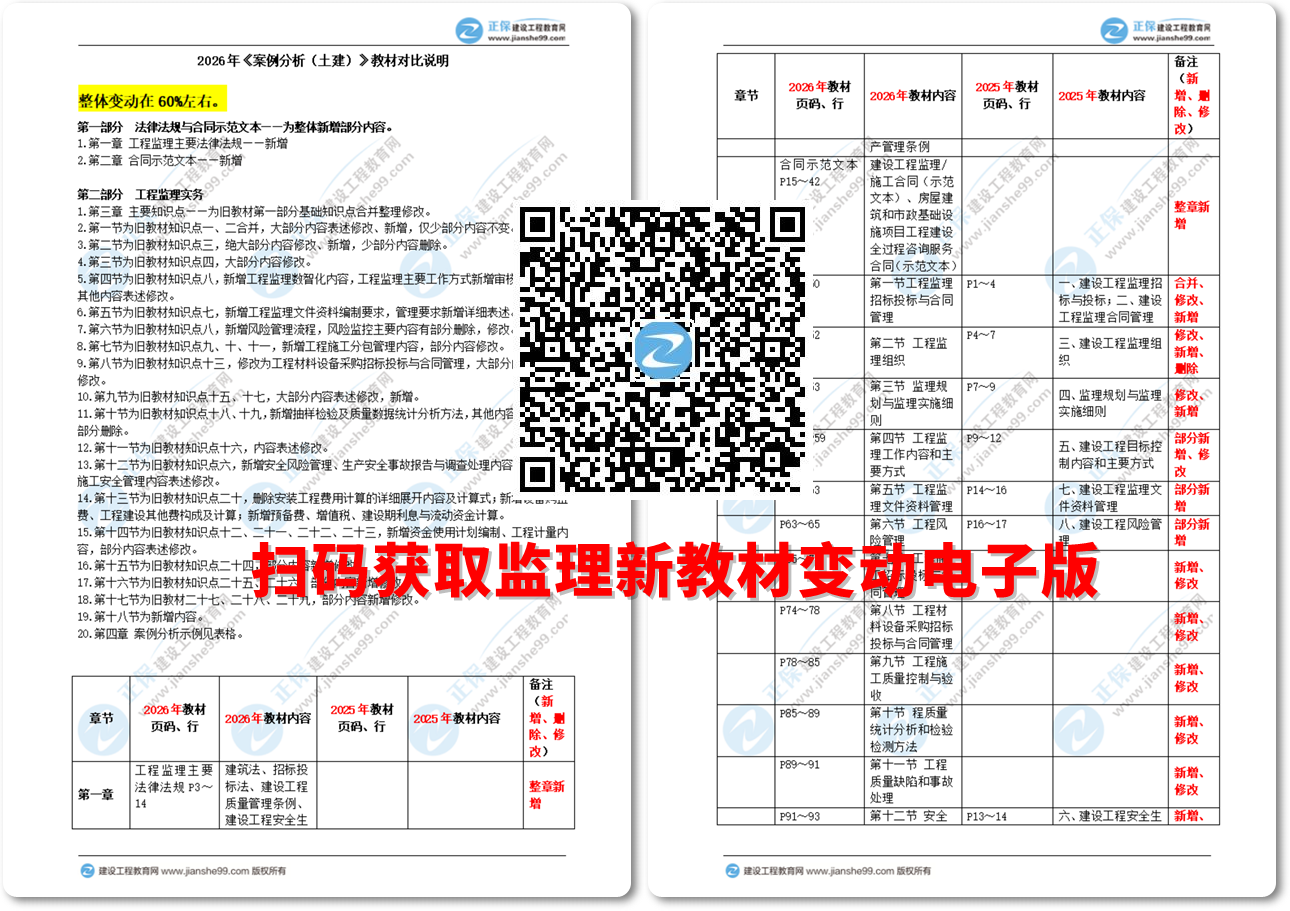 2026年監(jiān)理工程師考試官方教材正式發(fā)布,建設(shè)工程教育網(wǎng)老師為大家梳理2026年《土建案例》教材變動詳細內(nèi)容。具體如下: