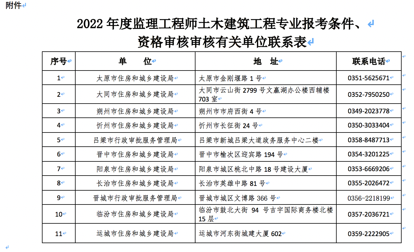 山西省住房和城鄉(xiāng)建設(shè)廳行政審批管理處:0351-7731395(土木建筑工程專業(yè)報(bào)考條件、資格審核);各市資格審核有關(guān)單位聯(lián)系方式見(jiàn)附件