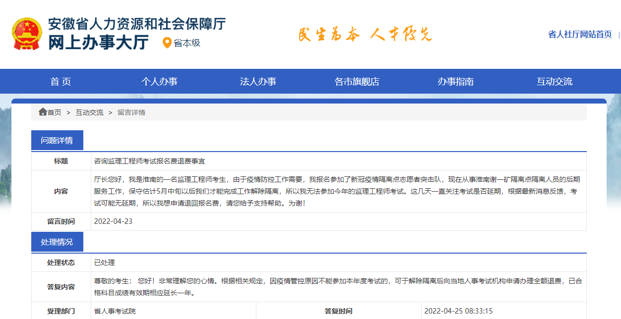 廳長您好,我是淮南的一名監(jiān)理工程師考生,由于疫情防控工作需要,我報名參加了新冠疫情隔離點志愿者突擊隊,現(xiàn)在從事淮南謝一礦隔離點隔離人員的后期服務工作,保守估計5月中旬以后我們才能完成工作解除隔離,所以我無法參加今年的監(jiān)理工程師考試。這幾天一直關注考試是否延期,根據(jù)最新消息反饋,考試可能無延期,所以我想申請退回報名費,請您給予支持幫助。為謝!