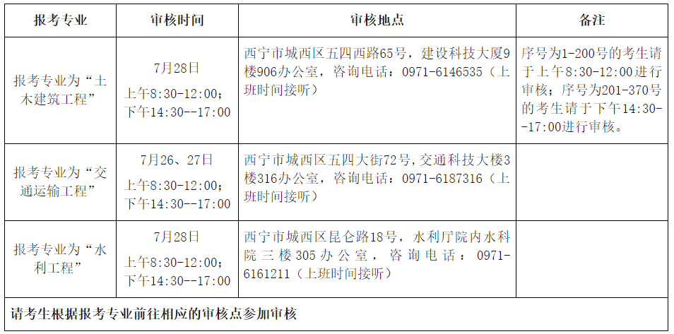 報考專業(yè)為“土木建筑工程”的考生只需攜帶原件,無需復印件。報考專業(yè)為“交通運輸工程”和“水利工程”的考生需攜帶原件及復印件,學信網(wǎng)查不到學歷認證報告的請攜帶學籍檔案材料。若本人不在西寧,可委托他人攜帶原件進行審核。