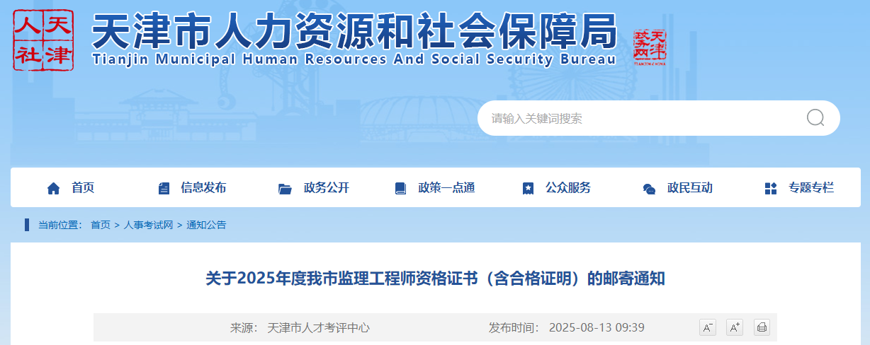 2025年度天津監(jiān)理工程師資格證書(shū)(含合格證明)的郵寄通知