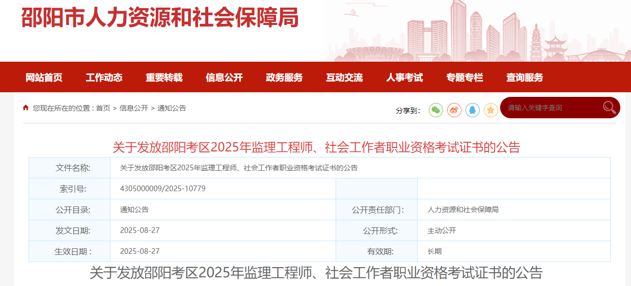 關(guān)于發(fā)放邵陽考區(qū)2025年監(jiān)理工程師、社會工作者職業(yè)資格考試證書的公告