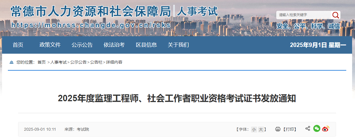湖南常德考點2025年度監(jiān)理工程師資格考試證書發(fā)放通知