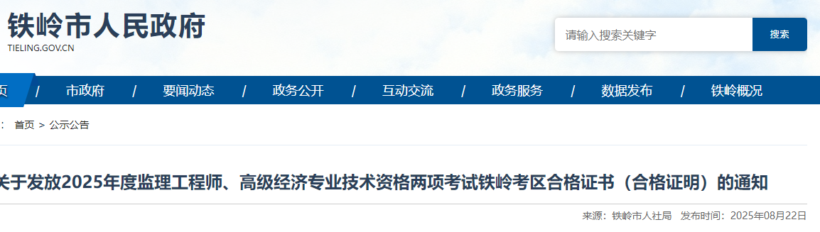 關(guān)于發(fā)放2025年度監(jiān)理工程師、高級(jí)經(jīng)濟(jì)專業(yè)技術(shù)資格兩項(xiàng)考試鐵嶺考區(qū)合格證書(shū)(合格證明)的通知