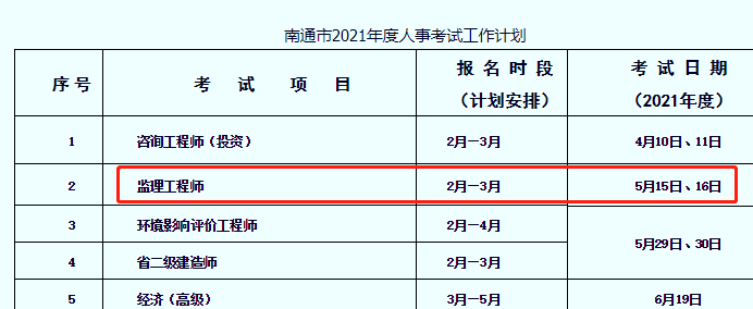 根據(jù)南通市發(fā)布的2021年度人事考試工作計(jì)劃通知來看,預(yù)計(jì)監(jiān)理工程師報(bào)名時(shí)段是2月-3月。
