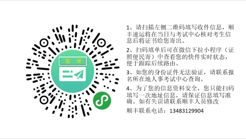 順豐速運在每天16:00取件郵寄。采取證到付款的方式將“執(zhí)業(yè)資格證書”送達到本人手中。請使用順豐速運郵寄的人員在每天14:00前填寫郵寄信息。