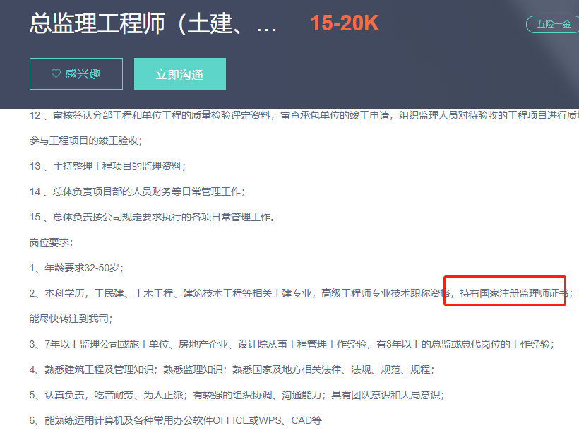 這是小編在某招聘軟件上截取的招聘要求及薪資,可以看出持有監(jiān)理工程師證書的總監(jiān),薪資并不是很低,付出一定會有所收獲,所以大家一定不要被外面的言語所困,符合監(jiān)理工程師報名條件,能報考監(jiān)理工程師考試的一定要報名,不給自己一次機會,永遠都不知道自己可以達到什么樣的高度,不固步自封,該學(xué)習學(xué)習,該努力努力,甭管大家怎么說,同樣的機會放在面前,相信考下證書的你一定會比沒考下的人機會更多~