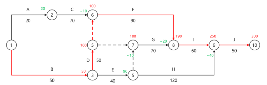 1.總工期300天;關(guān)鍵線路B→D→F→I→J;