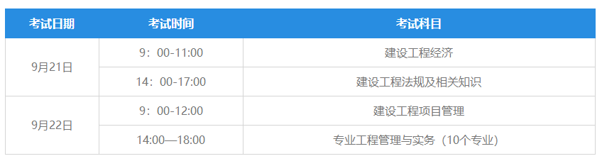 2019年一級建造師考試時間為9月21日至22日,具體安排如下:
