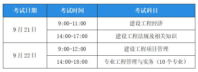 2019年一級建造師考試時間為9月21日至22日,具體安排如下: