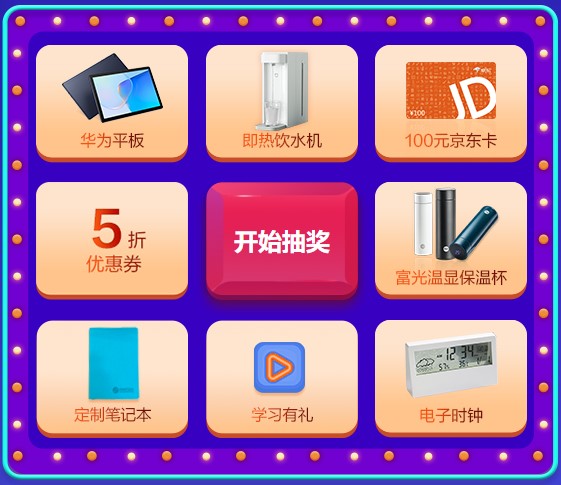 活動(dòng)期間每天登錄活動(dòng)頁(yè)面都可免費(fèi)參與幸運(yùn)大抽獎(jiǎng),有機(jī)會(huì)獲得華為平板、小米即熱飲水機(jī)、100元京東卡等好禮哦~