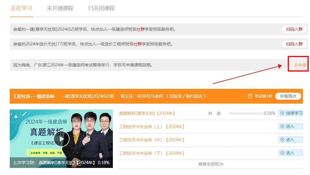 已經(jīng)報(bào)名網(wǎng)校2024年一級(jí)建造師考試超值精品班、高效實(shí)驗(yàn)班、VIP特訓(xùn)營(yíng)、面授特招班、臨考特訓(xùn)班課程的停考考生,現(xiàn)在可以申請(qǐng)延期課程了,入口在“我的網(wǎng)校我的家”,請(qǐng)大家及時(shí)申請(qǐng),不要錯(cuò)過(guò)。