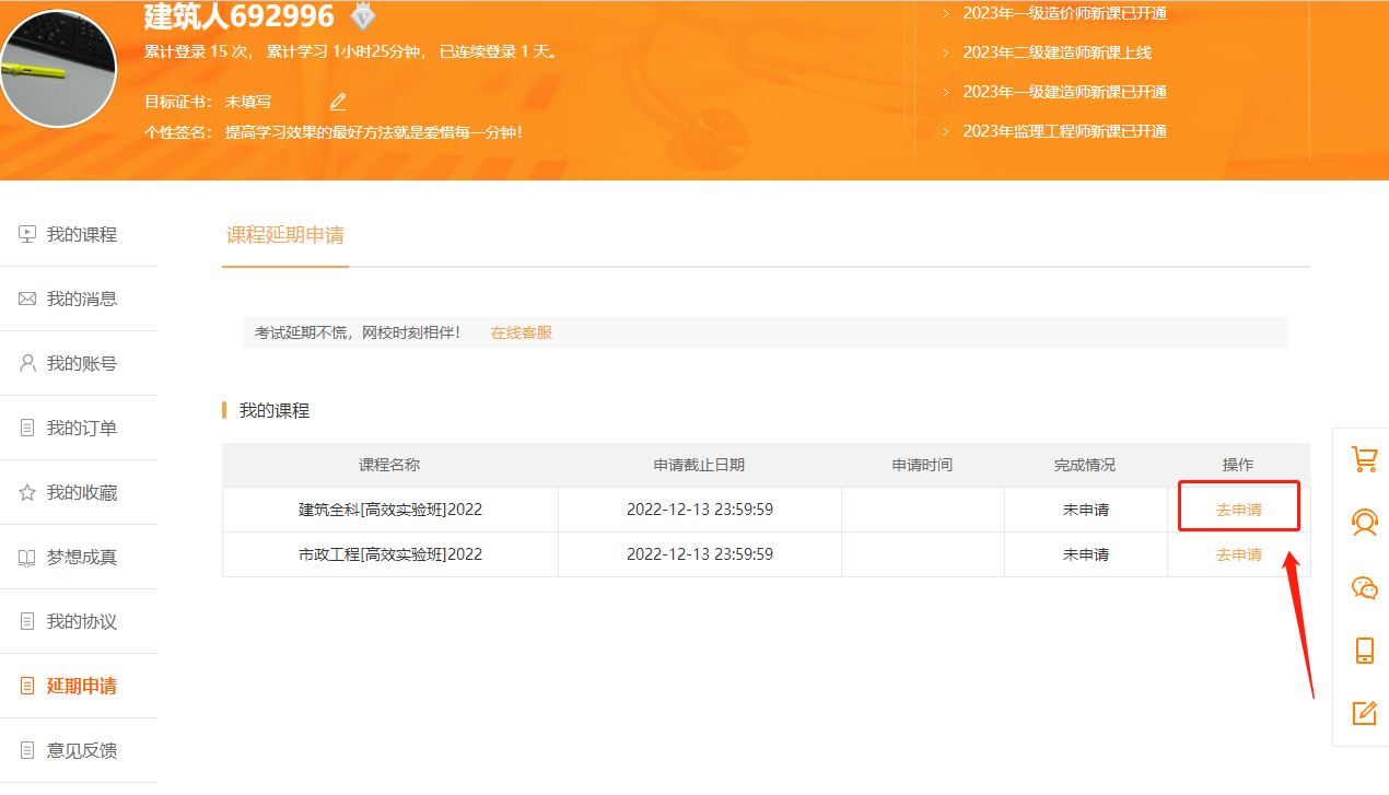 之前已經(jīng)報名網(wǎng)校2022年一級建造師考試課程的同學,可以申請延期課程了,入口在“我的網(wǎng)校我的家”,請大家及時申請,不要錯過。