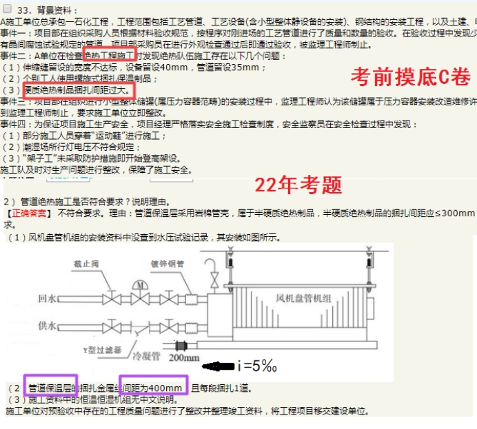 此次考試總體講:客觀題中規(guī)中矩,都是老師反復(fù)強調(diào)的知識點。主觀題實操性越來越強,圖文結(jié)合,考查考生將問題與教材理論接軌的能力。比如配電柜柜體的間隙要求?冷凝管的坡度要求——作為數(shù)字類的識圖挑錯題出現(xiàn);還有簡答型識圖題——自動扶梯的組成等。關(guān)于風(fēng)機盤管的安裝技術(shù)要求,半小問超出教材考查規(guī)范內(nèi)容,但對總體通過考試影響不大。