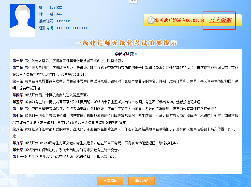 第二步:請認(rèn)真閱讀??颊f明,并點(diǎn)擊“馬上做題”按鈕,注意答題15分鐘以上成績有效。