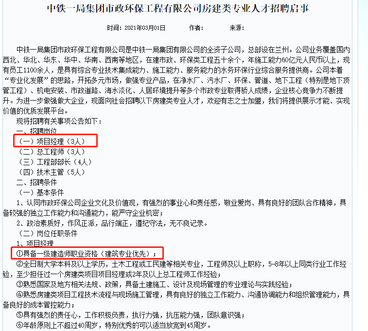 中鐵一局集團市政環(huán)保工程有限公司建類專業(yè)人才招聘啟事,招聘項目經(jīng)理的條件中顯示,具備一級建造師職業(yè)資格(建筑專業(yè)優(yōu)先),這也說明一建證書的重要性。