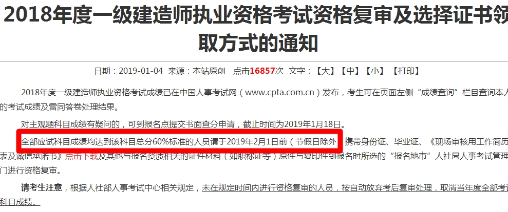 2018年一級建造師考試成績已公布,小伙伴們最關(guān)心的就是合格標準了,近幾年一級建造師的合格標準都為總成績的60%雷打不動,2018年的合格標準雖然還沒公布但基本也是如此,在1月3日西藏公布的考后復(fù)核文件,1月4日云南考后復(fù)核文件,1月9日重慶和1月11日廣東公布的考后復(fù)核文件中都寫到復(fù)核分數(shù)線為總成績的60%