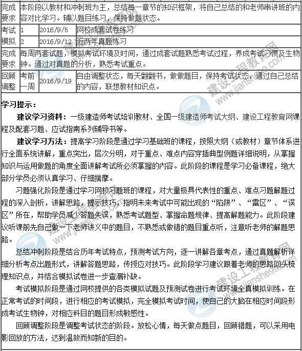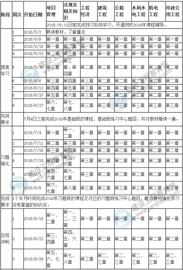 大家好!為幫助大家全力備戰(zhàn)2016年一級建造師執(zhí)業(yè)資格考試,建設工程教育網制定了這份《2016年一級建造師學習計劃表》,以方便同學們對一級建造師學習進度有全面掌控;希望這份計劃表對大家順利通過2016年的考試有所幫助。